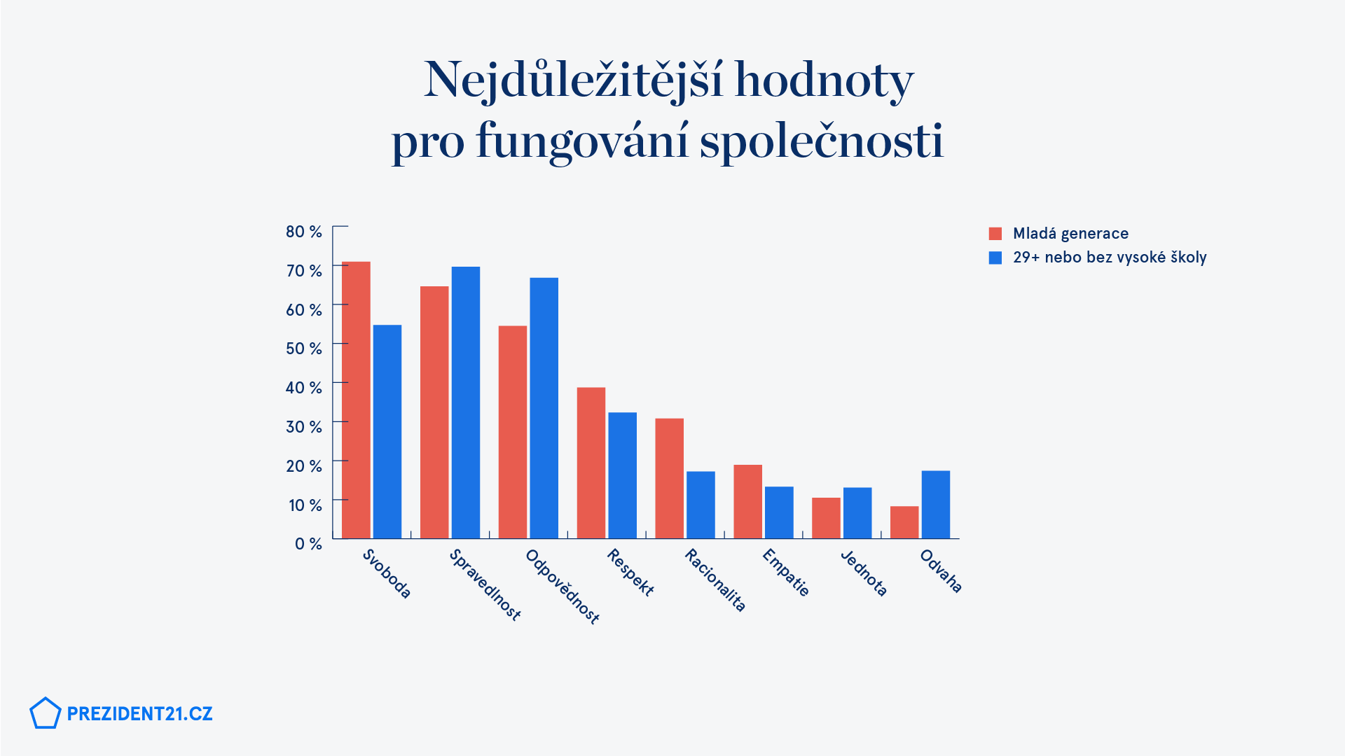 Starší generace nebo mladí bez titulu naopak považují za klíčovou hodnotu ve společnosti nejčastěji spravedlnost, tu zdůrazňuje skoro 70 %, stejně jako odpovědnost (67 %). Svobodě přisuzuje význam ve fungování společnosti jen 50 % internetové populace ve věku od 28 let nebo mladší bez vysokoškolského titulu.