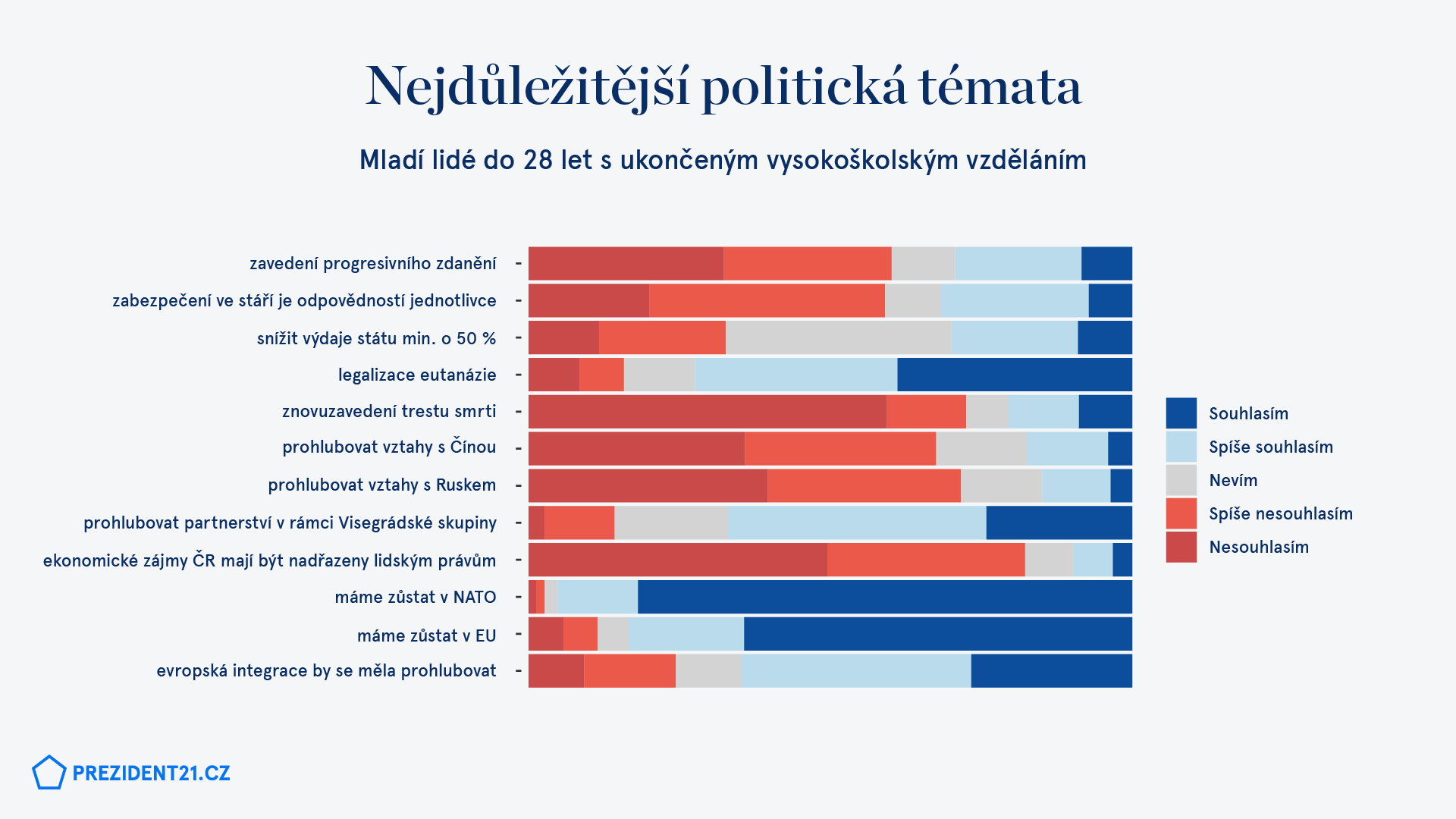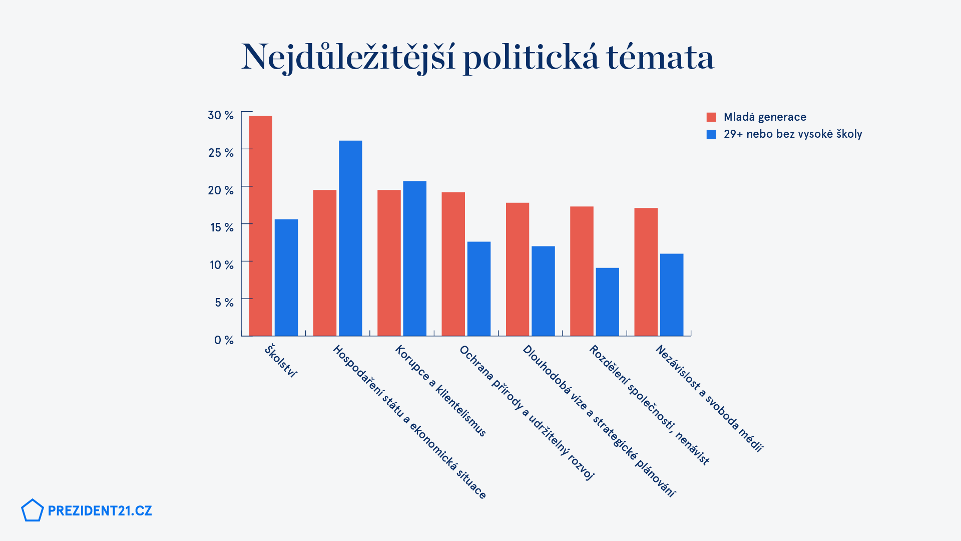 Názor mladých absolventů vysokých škol se od zbytku liší také v tom, jaká politická témata je pro ně podstatné a nepodstatné řešit. Za TOP téma považují školství, dále se zajímají o hospodaření státu a jeho ekonomickou situaci, korupci a klientelismus, ochranu přírody a udržitelný rozvoj a strategické plánování a dlouhodobé vize. Nejmenší prioritu dávají otázce nezaměstnanosti a kriminality. Starší generace nebo mladí lidé bez vysokoškolského vzdělání naopak ekologii ani plánování za zásadní témata nepovažují. Soustředí se stejně jako zmínění absolventi na hospodaření státu a ekonomickou situaci a korupci a klientelismus, výrazněji je však zajímá ještě kvalita justice a právního státu, zdravotnictví a migrace. Za nejméně závažná témata považují dopravu a začleňování menšin.*