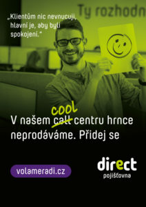 Práce v call centru nemá příliš dobrou pověst. Lidem se často vybaví dřina, stres, důraz na výkon a různá omezení. V Direct pojišťovně to ale funguje jinak, proto vznikla kampaň Voláme rádi (www.volameradi.cz), která ukazuje, že i práce v call centru může být normální. „Zaměřili jsme se na nejhorší nešvary z ostatních call center, kde lidem zakazují u práce pít nebo jíst a určují jim i to, kdy mohou chodit na záchod. U nás žádná taková nesmyslná nařízení a omezení nemáme. Snažíme se o to, aby se tu každý cítil příjemně,“ říká mluvčí Direct pojišťovny Nela Maťašeje.
